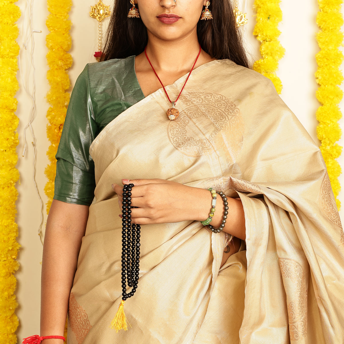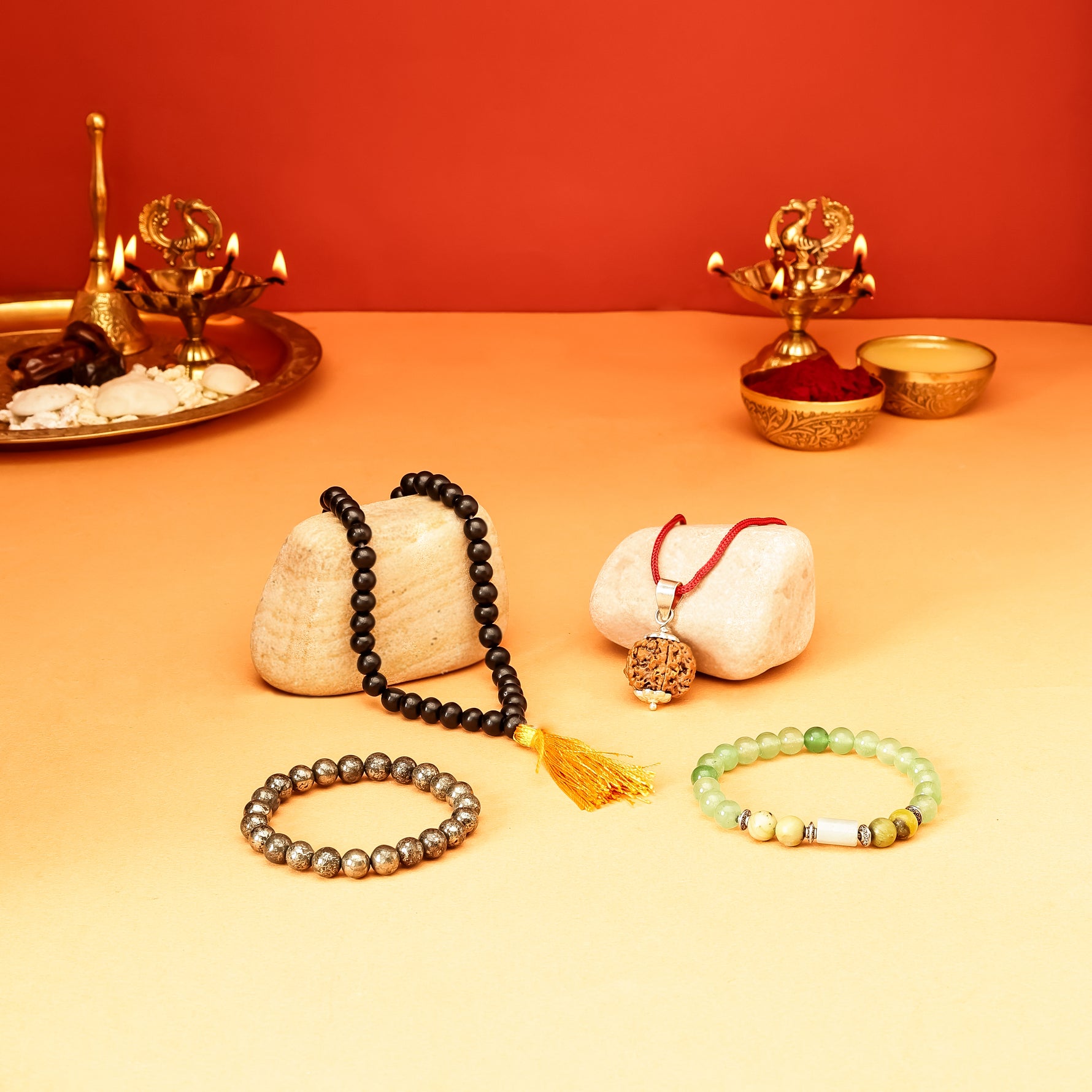 Inside the combo: Green Aventurine, Raw pyrite, Karungali Malai, 7 Mukhi. Each element is thoughtfully chosen for its aligned energies—helps restore vitality and focus, opens pathways to financial opportunity, and shields your aura from negativity.