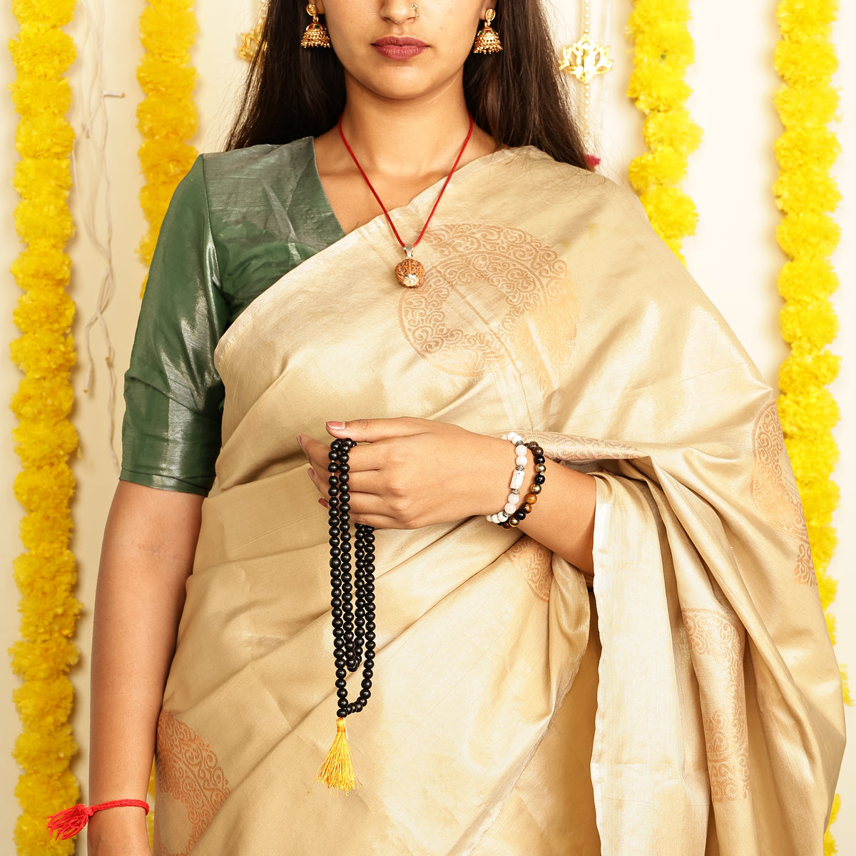 Inside the combo: Howlite, Tiger's Eye, Pyrite & Black Obsidian Triple Protection, Karungali Malai, 7 Mukhi. Each element is thoughtfully chosen for its aligned energies—helps restore vitality and focus, opens pathways to financial opportunity, and shields your aura from negativity.