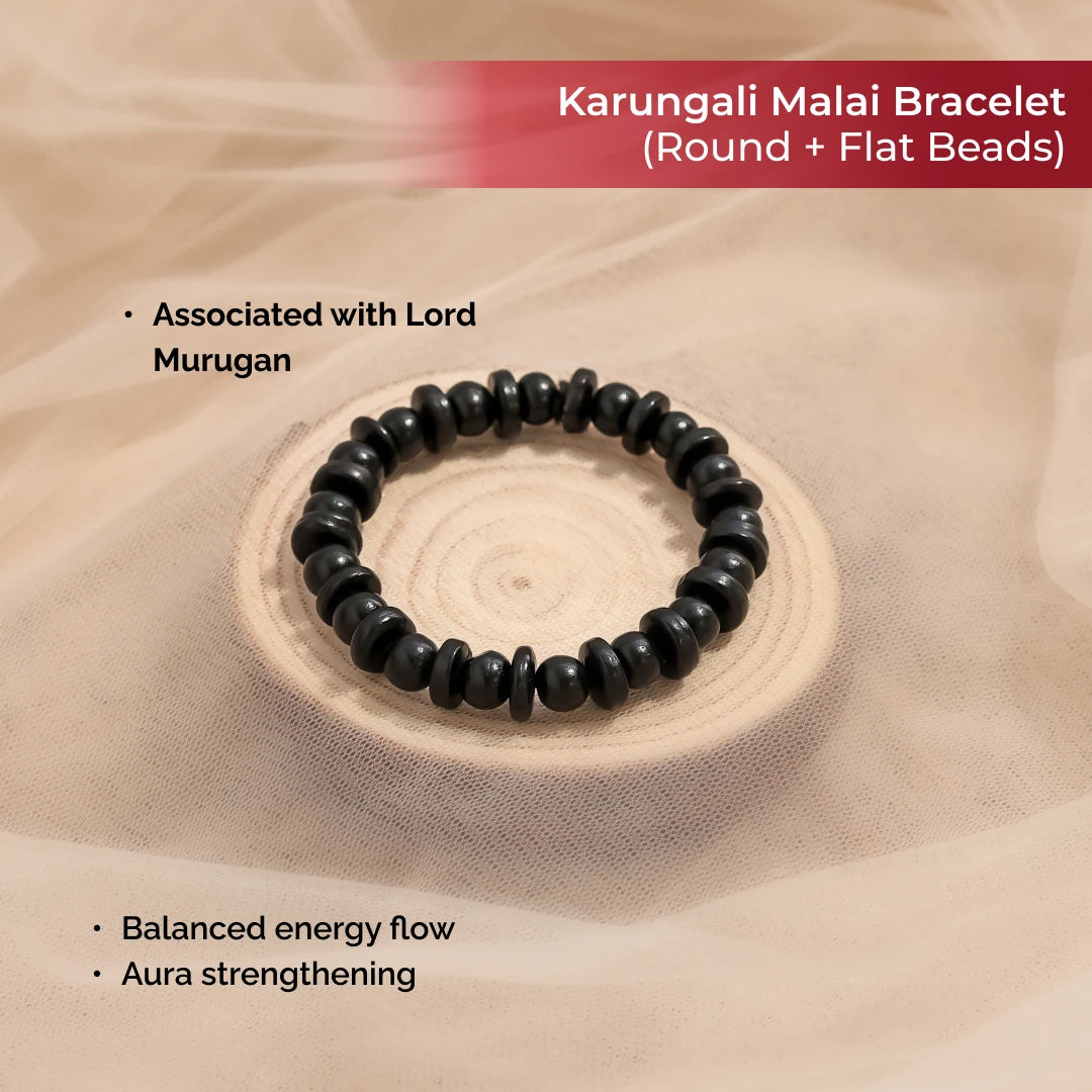 The Divine Hindu Karungali Bracelet is handcrafted from sacred Ebony Wood (Karungali), renowned for its power to ward off negativity and attract prosperity. What sets this bracelet apart is its unique alternating round and disc bead pattern, giving it a bold and distinctive look while maintaining deep spiritual significance. Perfect for those who want protection, balance, and style in one sacred accessory.