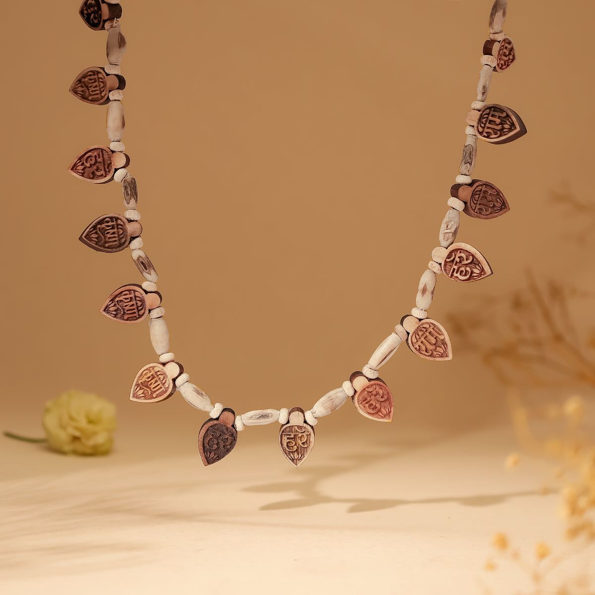 - Material: Authentic Tulsi wood with engraved "Hare" and "Krishna" on 16 petals.