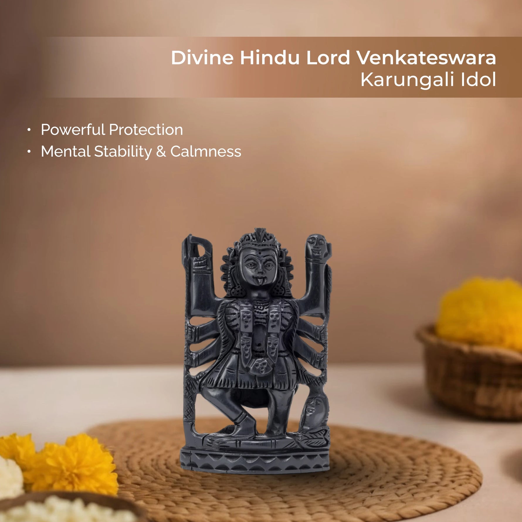 Invoke divine power and protection with the Divine Hindu Karungali Goddess Kali Maa Idol, beautifully handcrafted from authentic black ebony wood (Karungali). Depicted with multiple arms, Maa Kali symbolizes strength, courage, and the victory of good over evil. This sacred idol radiates divine energy, removing negativity and inviting prosperity, making it ideal for home temples, meditation, and spiritual gifting. Crafted with precision, it blends artistic elegance with deep spiritual essence.