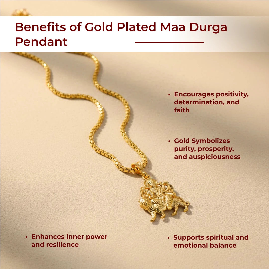 Invoke the fierce and protective energy of Maa Durga with this gold-plated pendant. Beautifully crafted, it represents strength, courage, and divine grace, making it a powerful symbol of protection and empowerment.