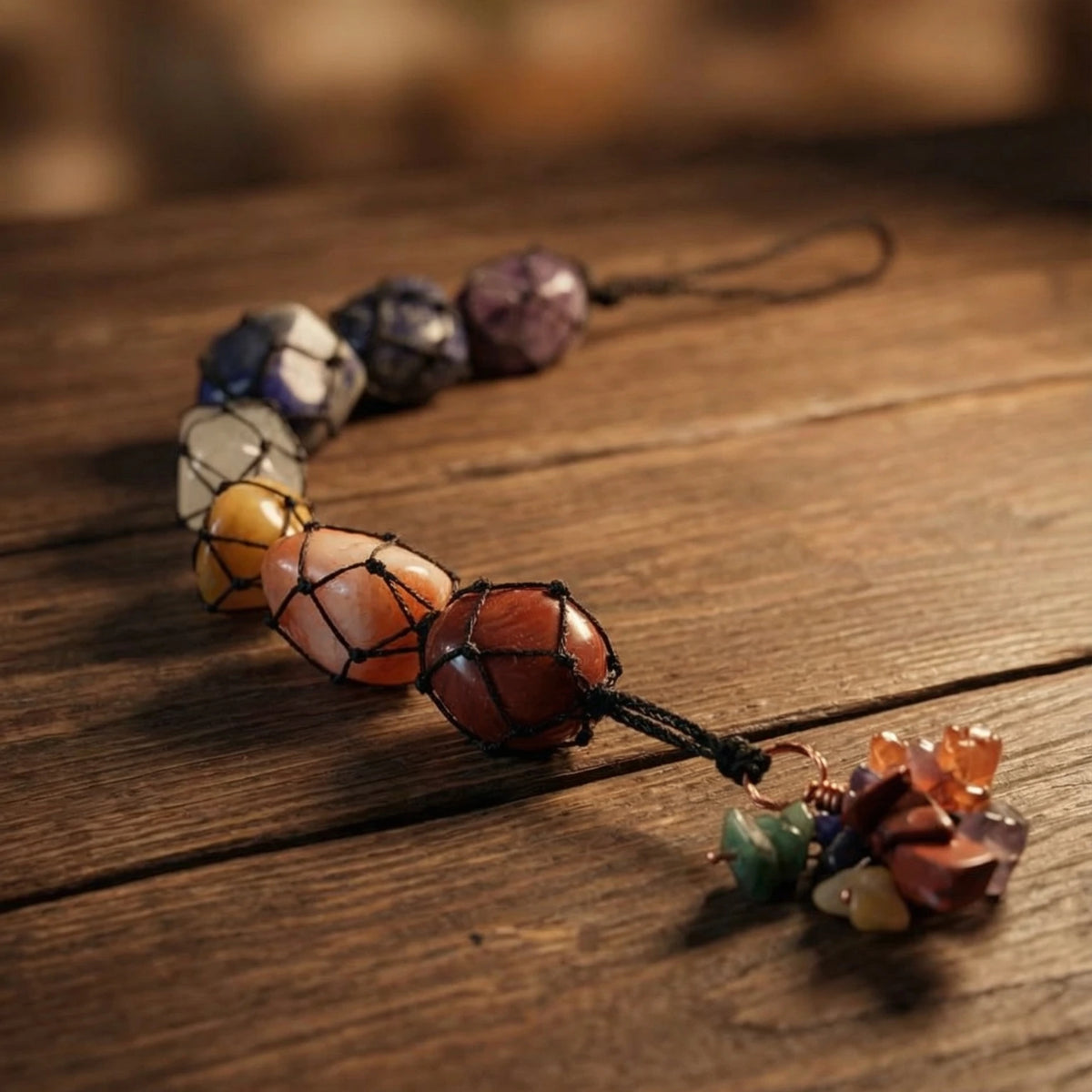 Authentic Multi-Stone Design: Includes a sequence of natural stones such as Amethyst, Lapis Lazuli, Sodalite, Green Aventurine, Yellow Calcite, Carnealin, and Red Jasper to represent the full chakra spectrum.