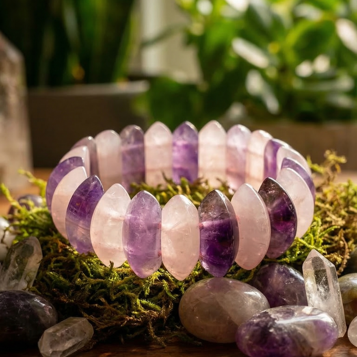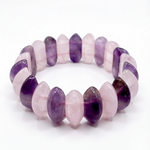 Experience the perfect balance of love and tranquillity with the Amethyst & Rose Quartz Oval Cut Bracelet from Divine Hindu Ñ a divine combination of two of the most powerful healing stones, handcrafted with premium oval-cut natural gemstones that work in harmony to heal the heart and calm the mind.