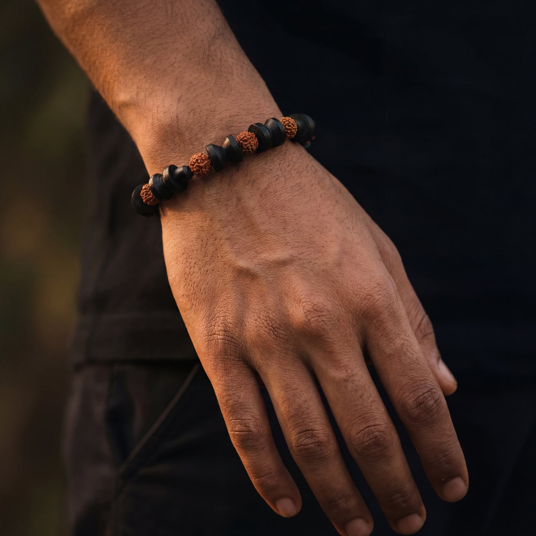 Invoke the supreme energy of Mahakal the Great Lord of Time with this powerful Mahakal Shivling Rudraksha Bracelet. Featuring sacred 5 Mukhi Rudraksha beads anchored by a divine Shivling charm, this bracelet is a devotional tribute to Lord Shiva in his highest form as Mahakaleshwar. Wearing it is believed to dissolve fear, grant fearlessness, and align the wearer with Shiva's timeless cosmic power.