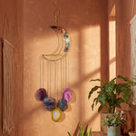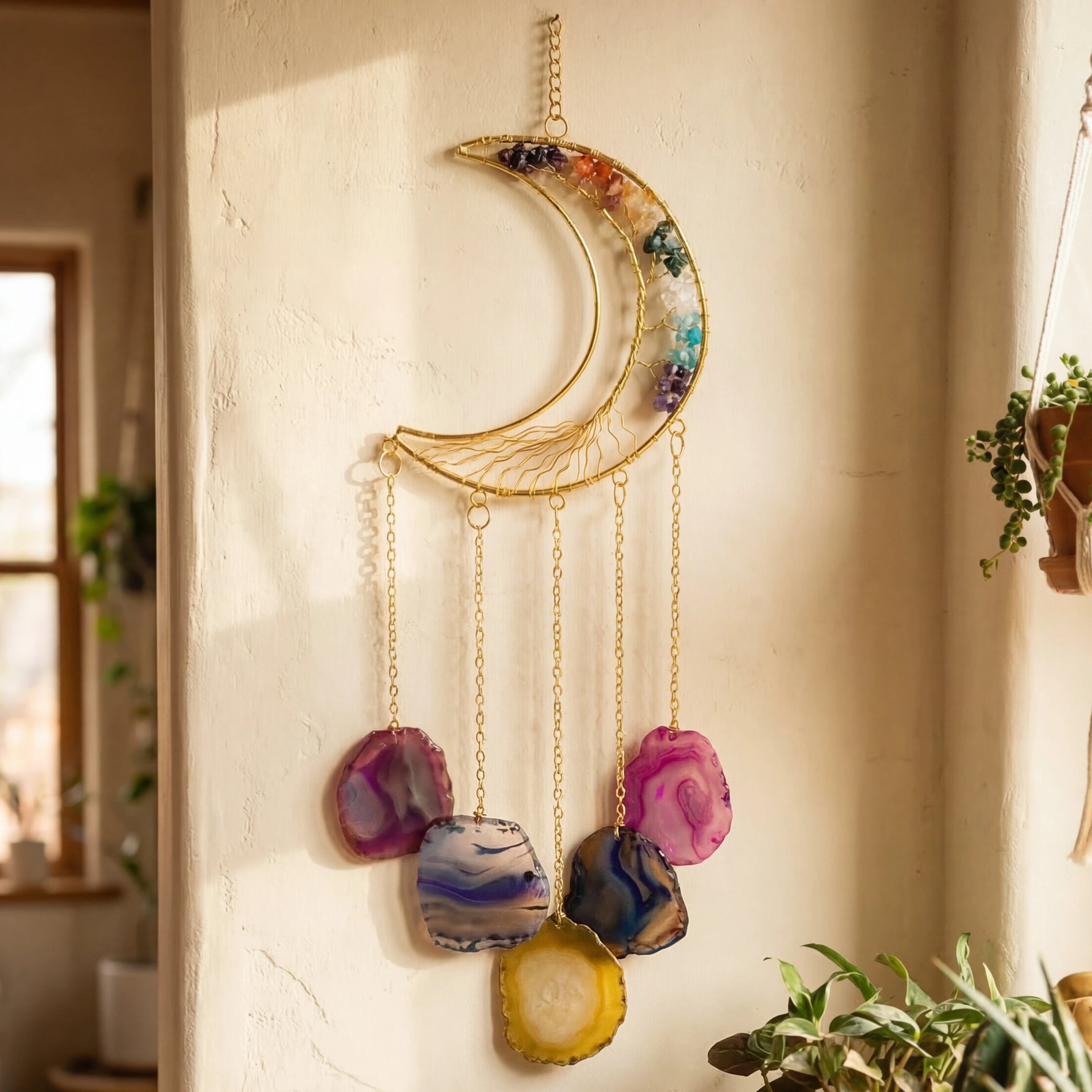 Infuse your home with celestial beauty and spiritual balance with our 7 Chakra Moon Dream Catcher. This stunning wall hanging features a crescent moon frame intricately woven with wire and adorned with seven distinct crystal chips representing each primary chakra. Suspended from the golden-toned moon are five vibrant, large polished agate slices that catch the light, adding a natural and protective vibration to your living space.