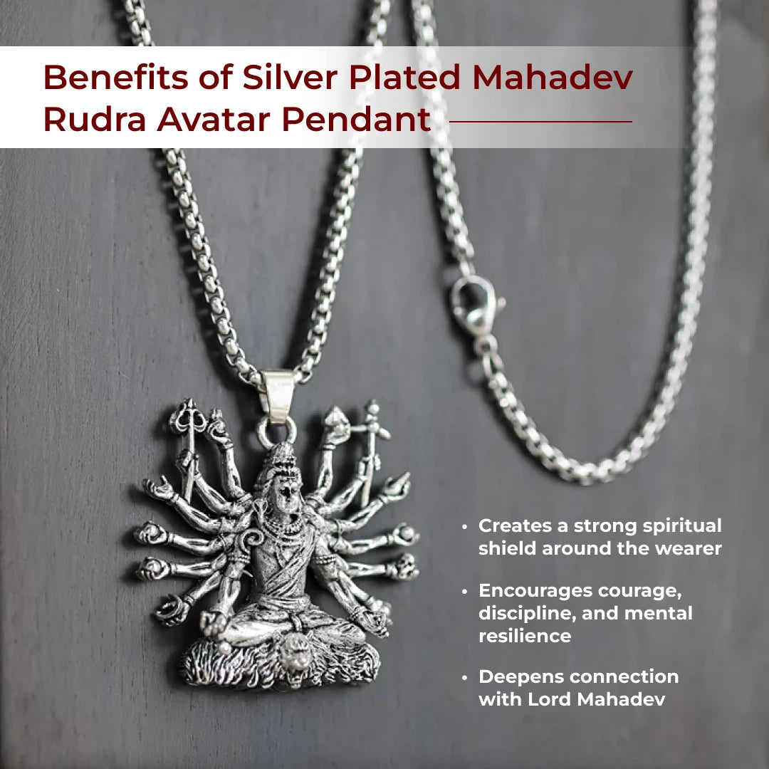 Embrace the fierce and protective energy of Lord Shiva with the Mahadev Rudra Avatar Pendant from Divine Hindu. This intricately designed piece captures the powerful "Rudra" form of Mahadev, featuring the multi-armed deity in a meditative yet commanding posture, complete with traditional weapons and symbolic attributes.