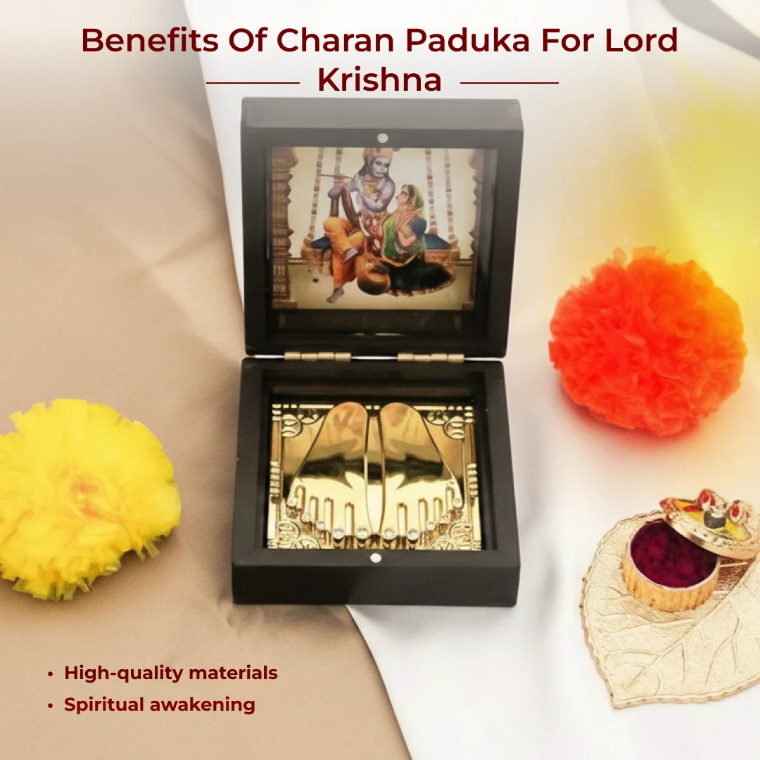 Made from high-quality materials and lavishly plated with gold, these padukas serve as a beautiful reminder of Krishna's teachings and the path to spiritual enlightenment. Known for his enchanting persona and the profound teachings of the Bhagavad Gita, Lord Krishna is a revered figure whose life and lessons continue to inspire devotion and spiritual awakening.