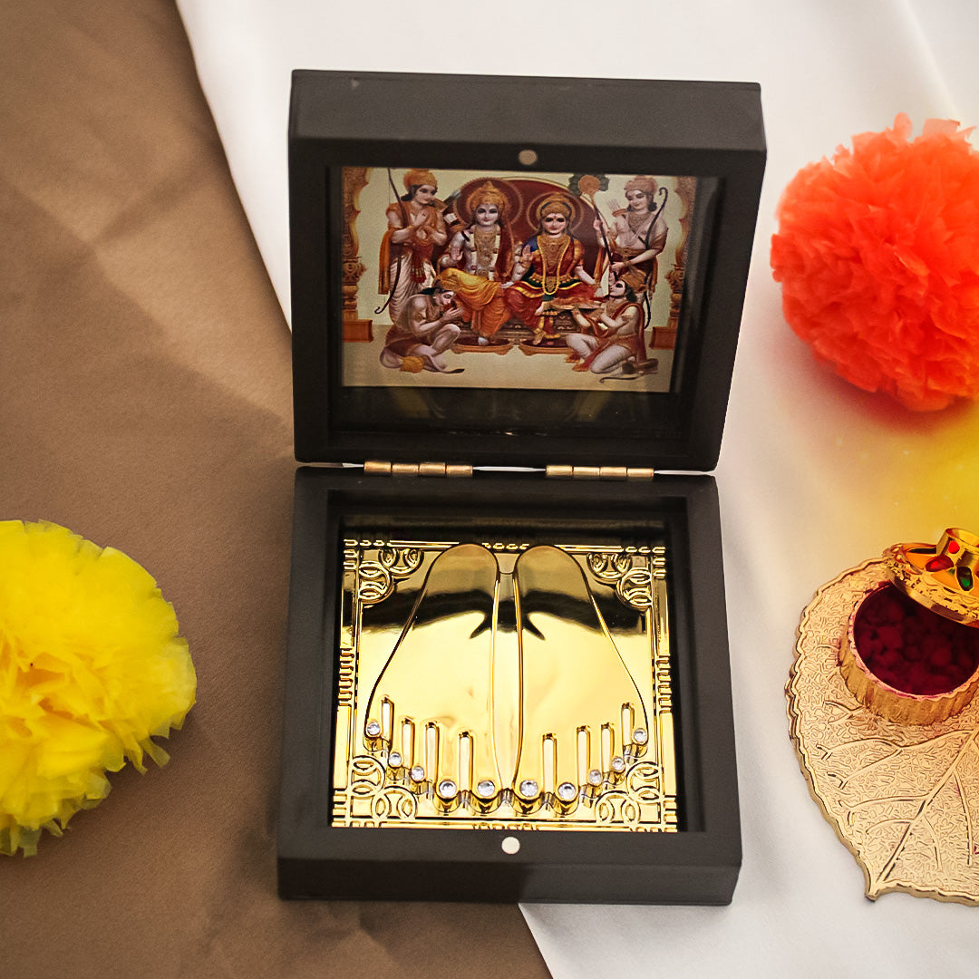 Revered by devotees around the world, the gold-plated feet symbolize the spiritual path laid down by Shri Ram, encouraging followers to walk in his footsteps towards truth, justice, and harmony.