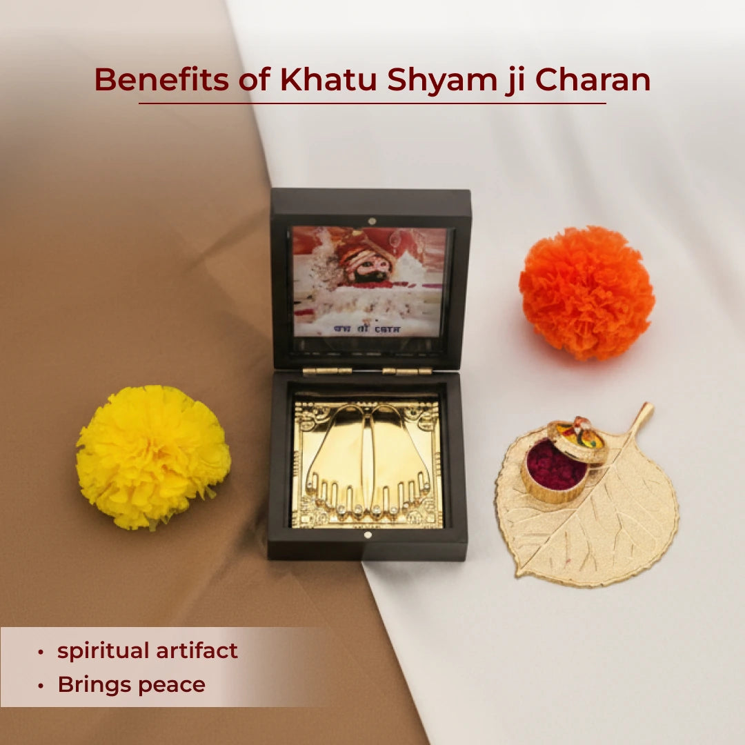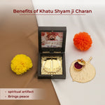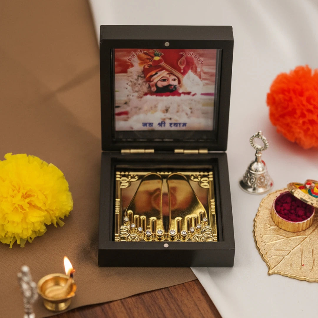 Discover the divine blessings of Khatu Shyam Ji with our Charan Paduka Box, a beautifully crafted spiritual artifact featuring intricately designed, gold-plated feet.
