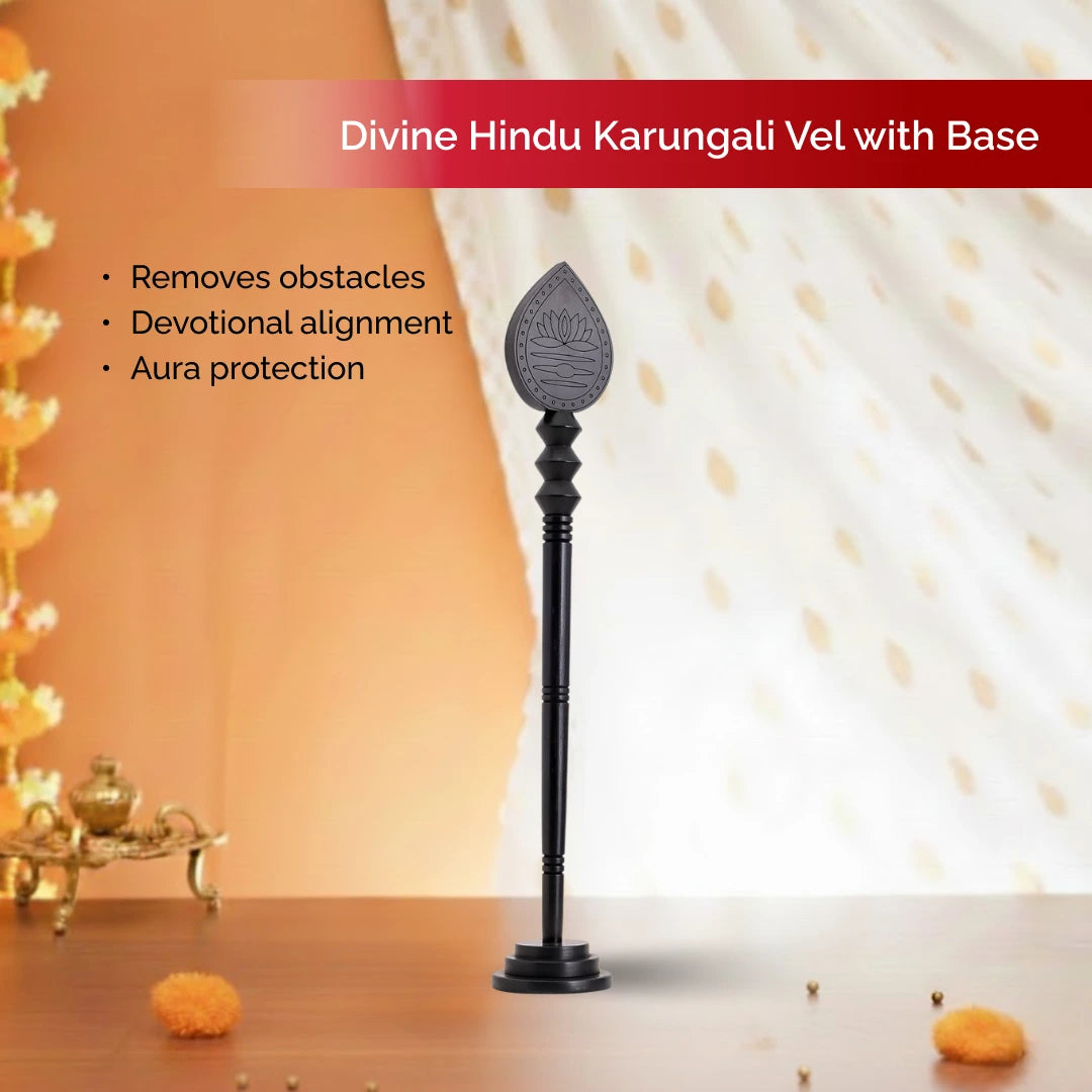 The Wooden Karungali Vel with base is a sacred emblem revered in Hindu tradition, symbolizing the power and protection of Lord Murugan vel. It is crafted from original Karungali wood, this Vel embodies spiritual purity and divine energy.