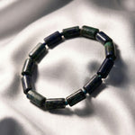 This bracelet features natural lapis lazuli stones carved into unique, rectangular block shapes, separated by small coordinating spacers for a structured, architectural look. Each bead is a miniature galaxy, often featuring shimmering flecks of golden pyrite and cloudy streaks of white calcite, ensuring your bracelet is a completely unique work of natural art. Strung on a durable, high-quality band, it offers a sophisticated balance of bold color and modern, geometric design.