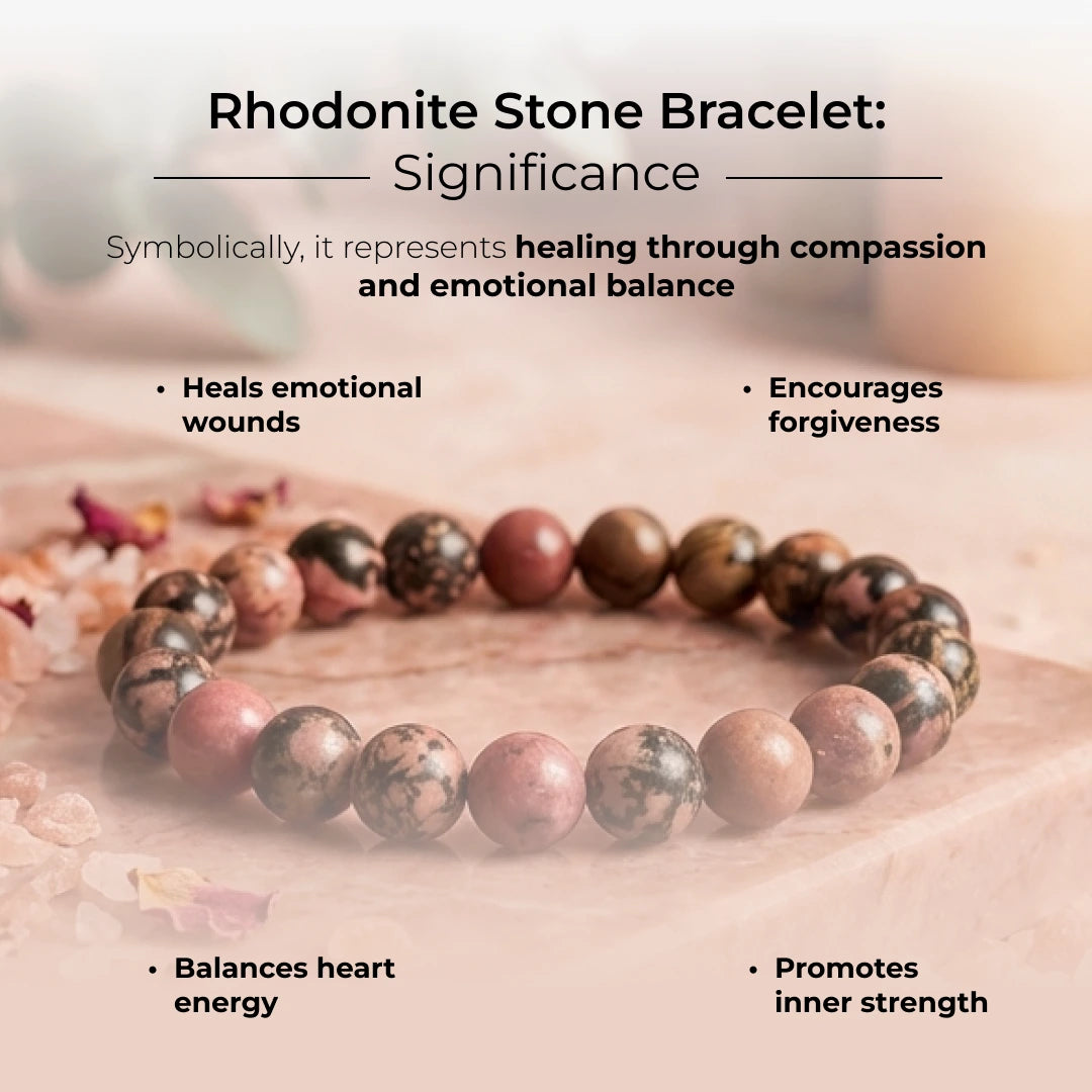 Embrace healing through love with our Rhodonite Bracelet, a heart-centered stone known for emotional balance, compassion, and forgiveness. With its soft pink hue laced with earthy black veins, Rhodonite is often called the Stone of Emotional Healing.