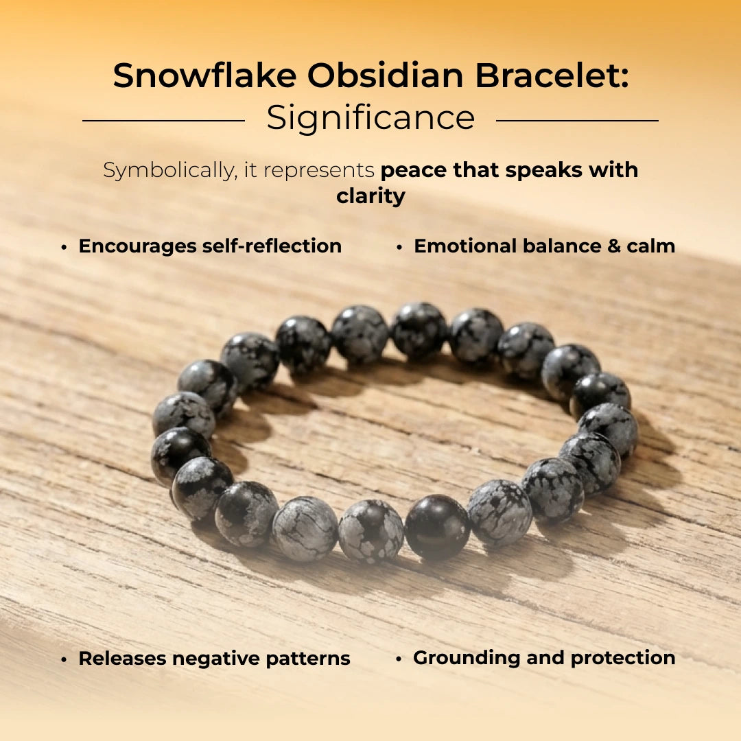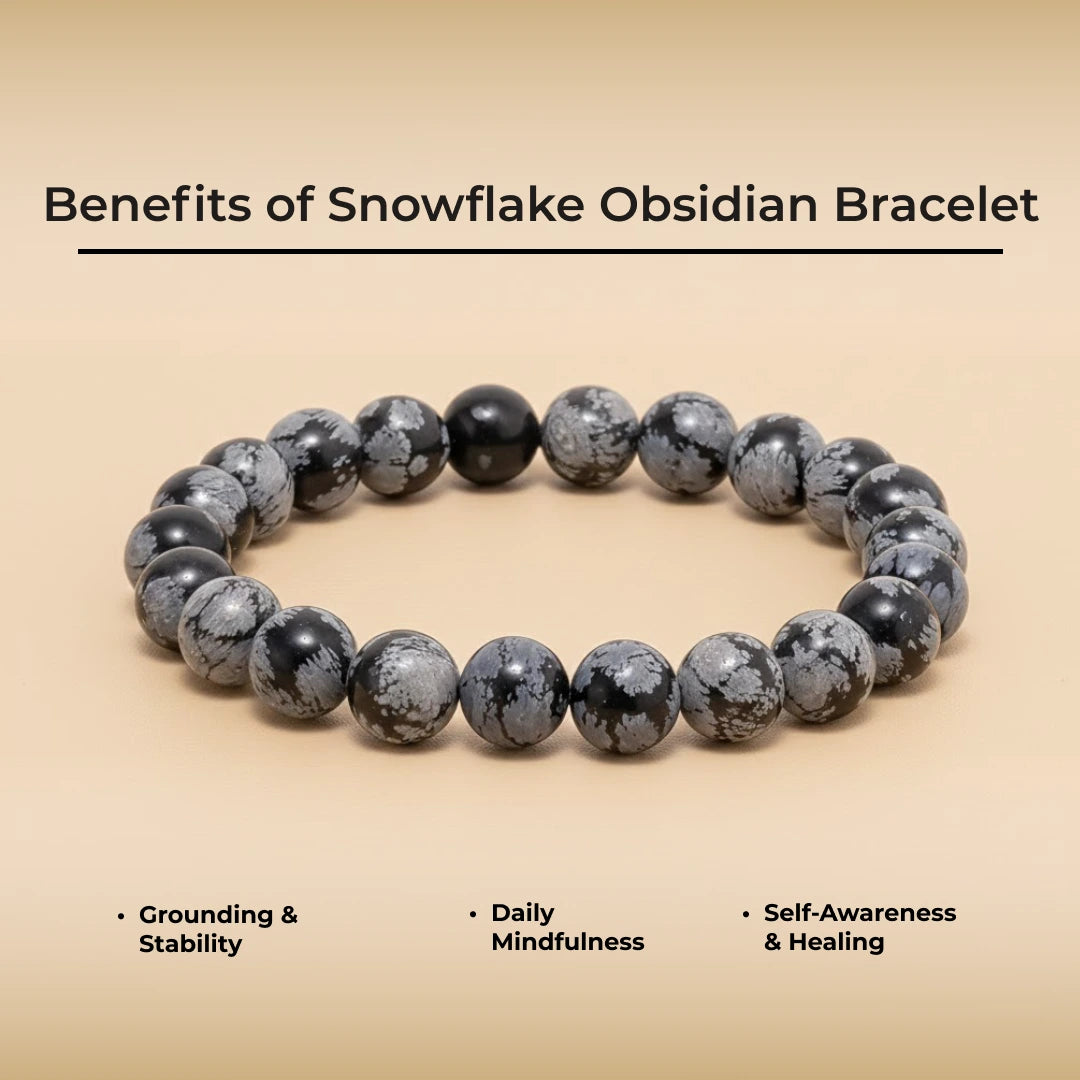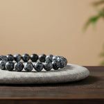 Embrace the striking contrast and powerful energy of this genuine Snowflake Obsidian Beaded Bracelet. Featuring smooth, highly polished dark beads with delicate white "snowflake" patterns, this piece offers a sophisticated, monochromatic elegance perfect for any occasion.