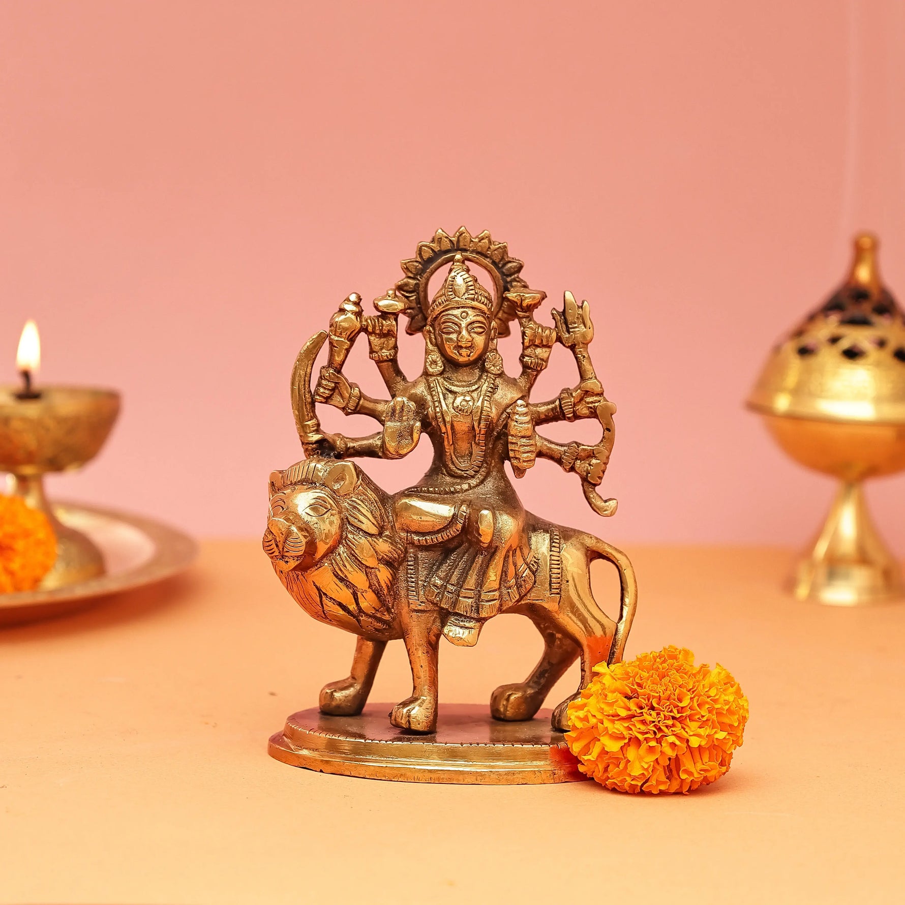 The Divine Hindu Durga Maa Brass Idol depicts the Goddess in her powerful form, riding a lion and holding her divine weapons. Symbolizing courage, strength, and protection, this handcrafted idol radiates divine energy and positivity. Made from high-quality brass with intricate detailing, it is perfect for home temples, pooja rooms, or as a sacred gift during Navratri and other auspicious occasions.