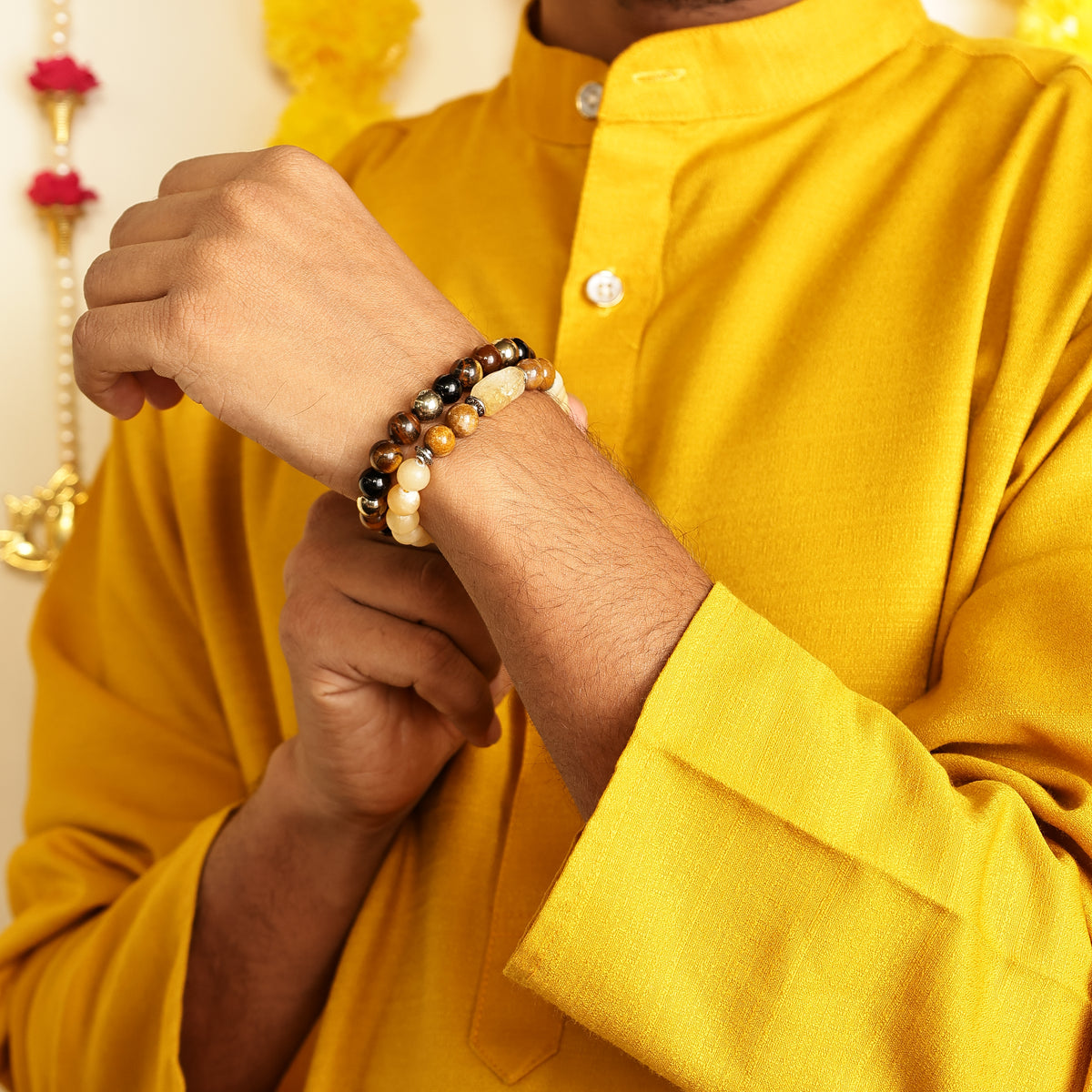 Inside the combo: Yellow Calcite, Tiger's Eye, Pyrite & Black Obsidian Triple Protection. Each element is thoughtfully chosen for its aligned energies—supports physical vitality, clarity, and material prosperity—helping you build a strong foundation for long-term growth.