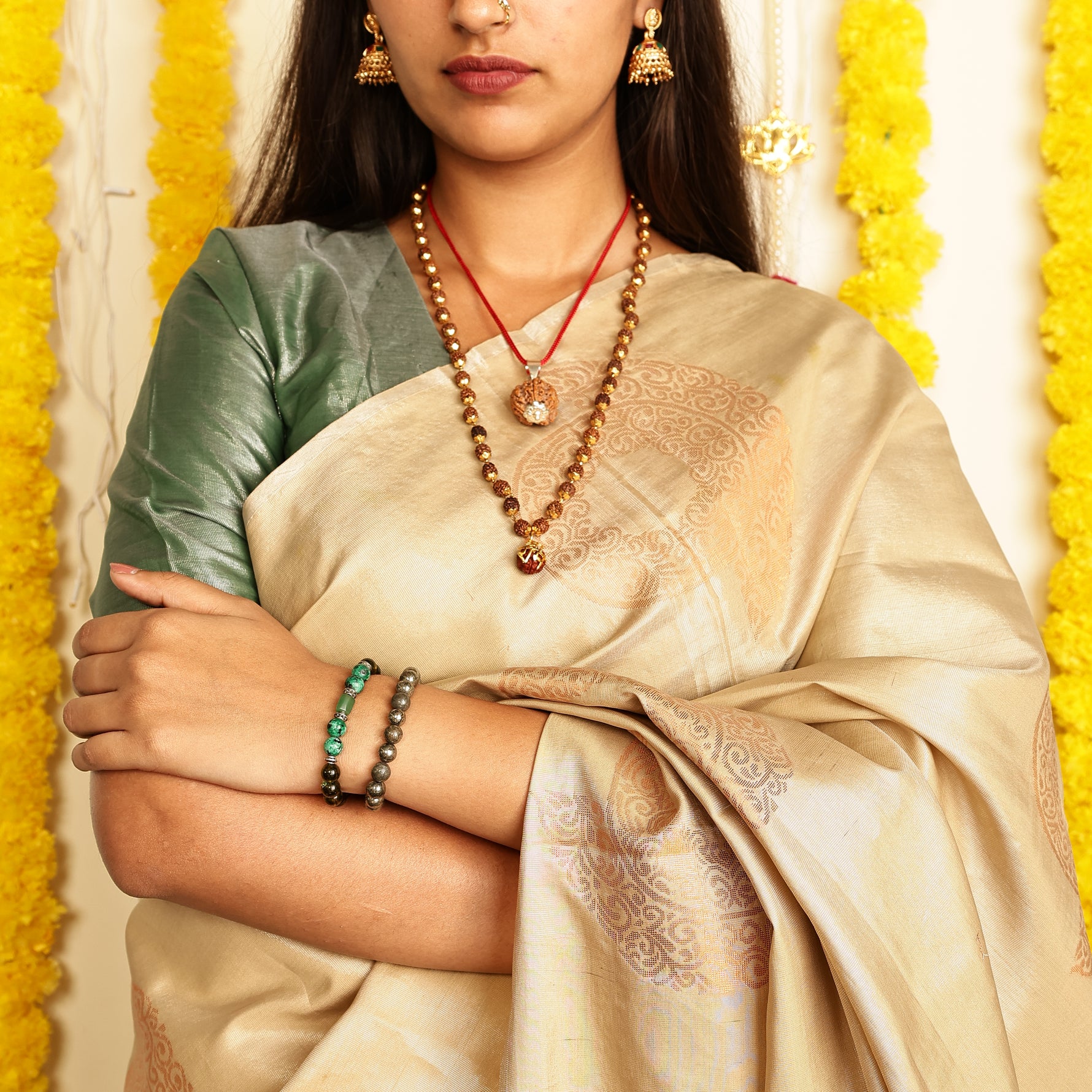Inside the combo: Green agate, Raw pyrite, Divine Rudraksha pendant, 7 Mukhi. Each element is thoughtfully chosen for its aligned energies—helps restore vitality and focus, opens pathways to financial opportunity, and shields your aura from negativity.